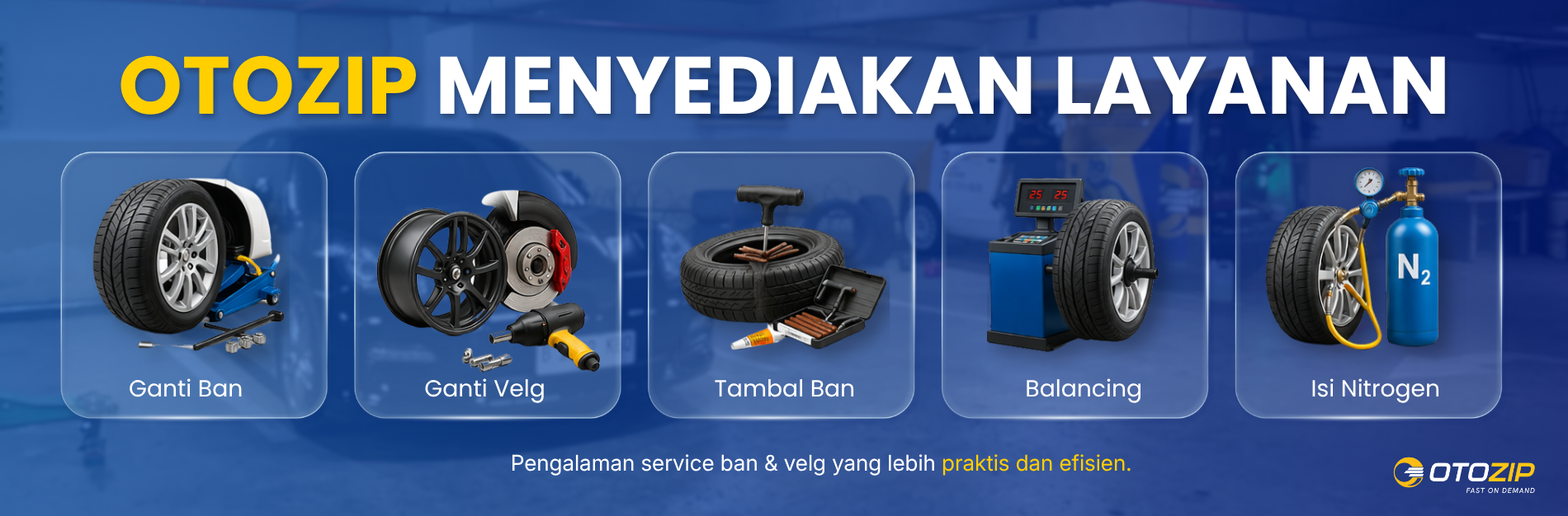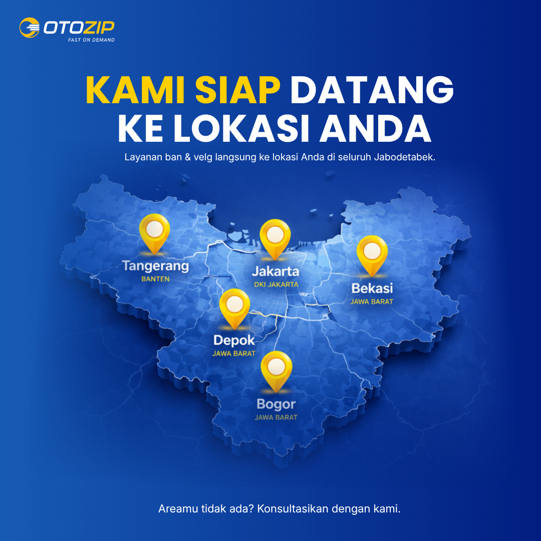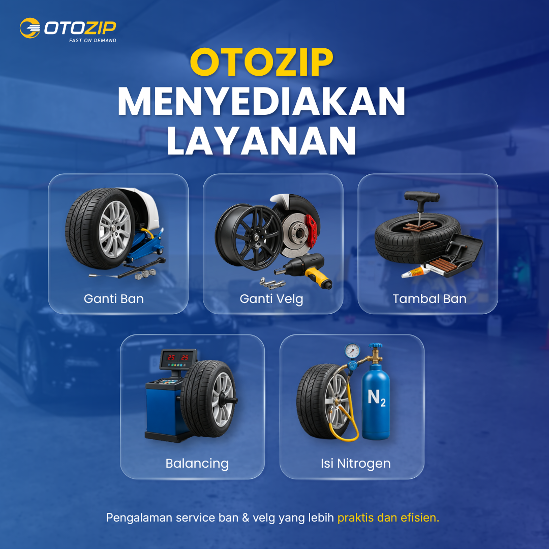 Ganti ban, velg, atau tambal ban tanpa ke bengkel. Otozip datang langsung ke rumah atau kantor kamu.